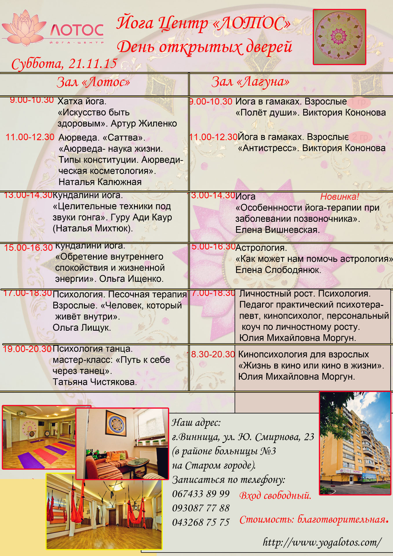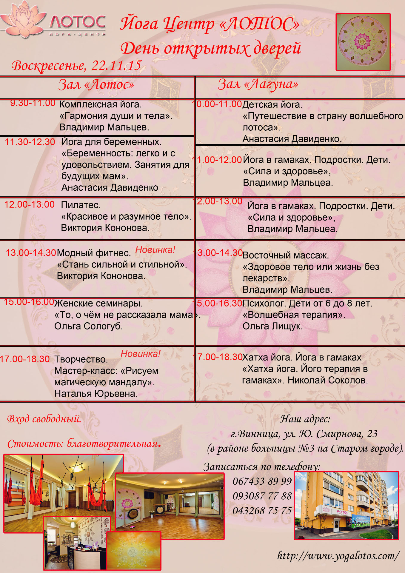 Приглашаем всех желающих на «Дни открытых дверей» в Йога Центре «Лотос», которые состояться 21.ноября 2015 (суббота) и 22 ноября 2015(воскресенье).